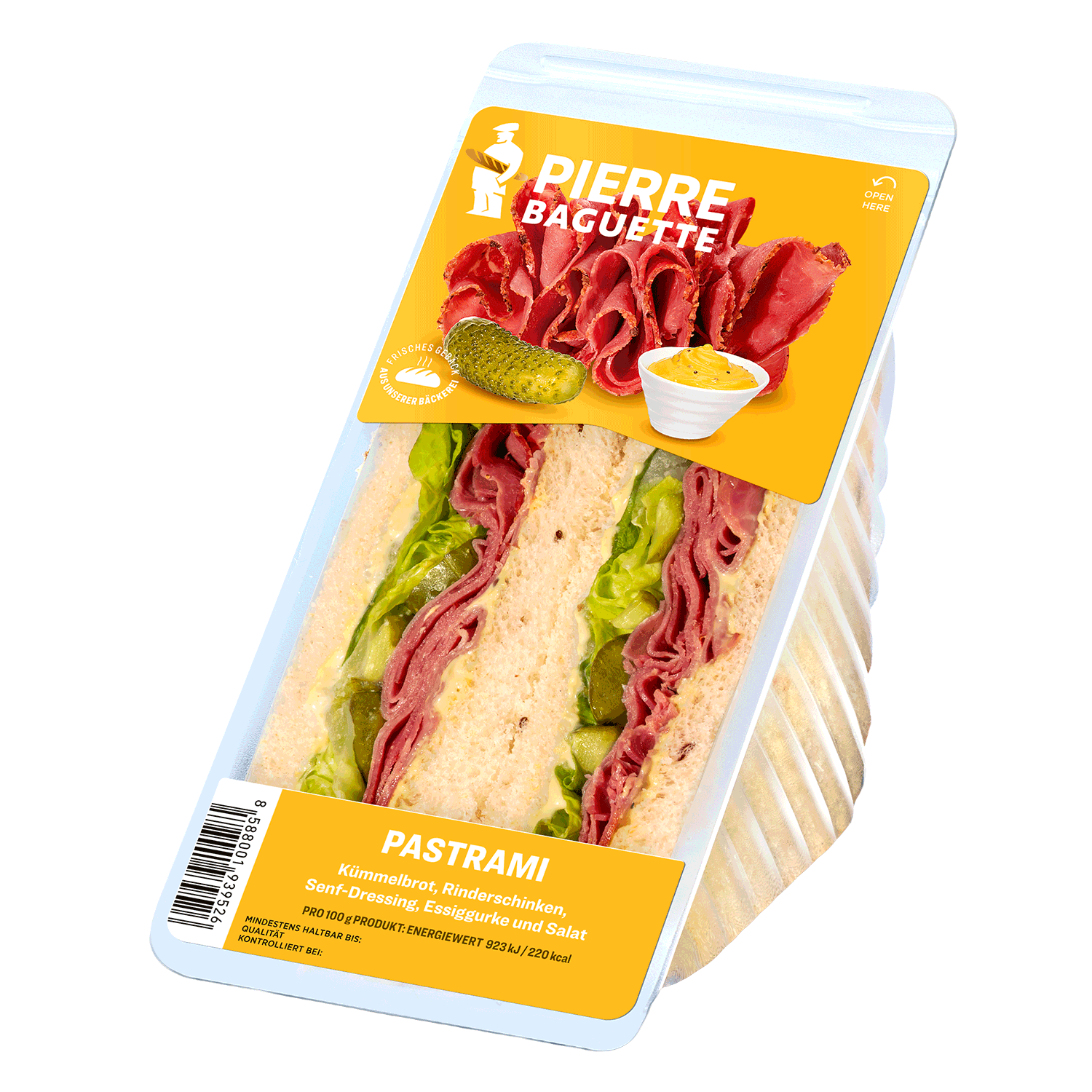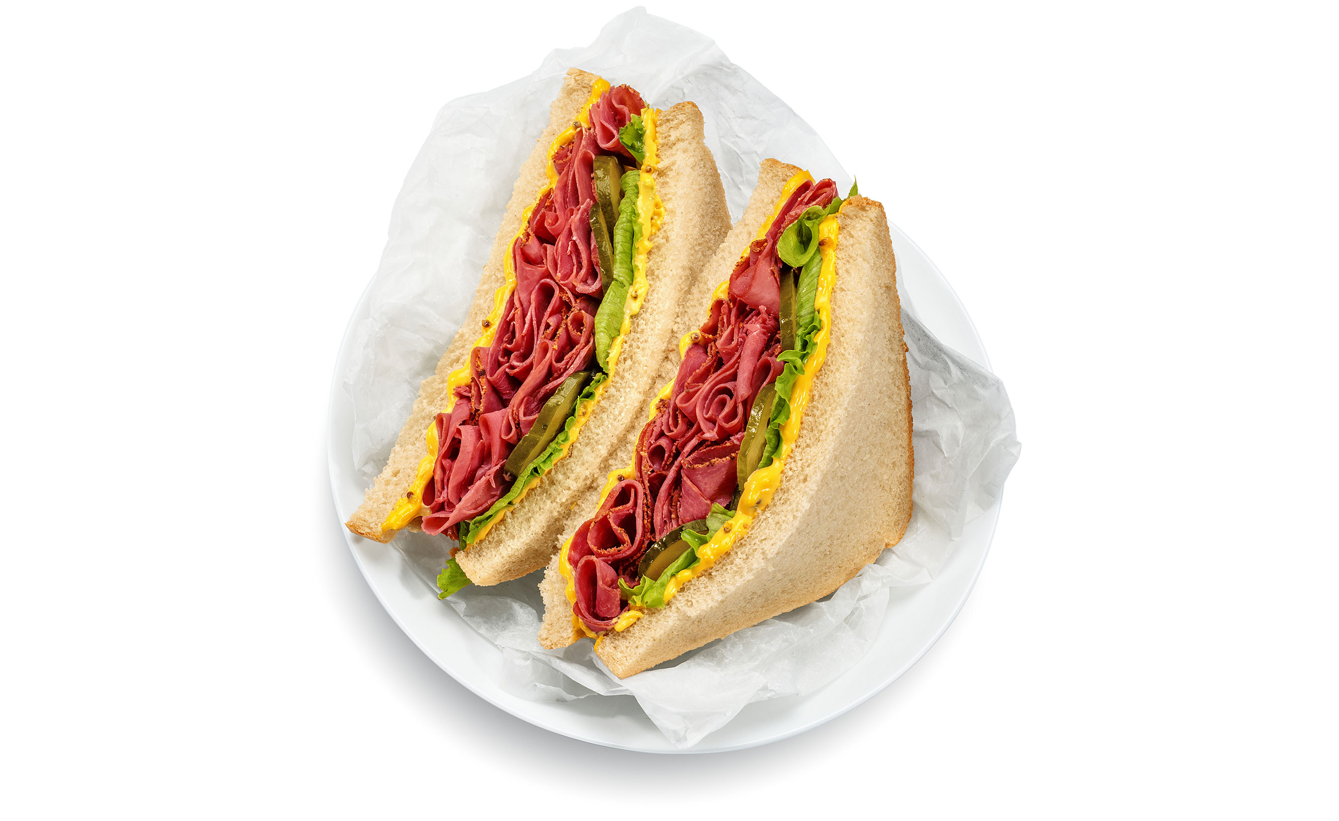 Unser neu entwickeltes weiches Weizen-Kartoffelbrot aus unserer Bäckerei wird ergänzt durch Pastrami-Rinderschinken, Senfdressing, eingelegte Essiggurke und frischen Blattsalat. Dies ist das legendäre New Yorker Sandwich.