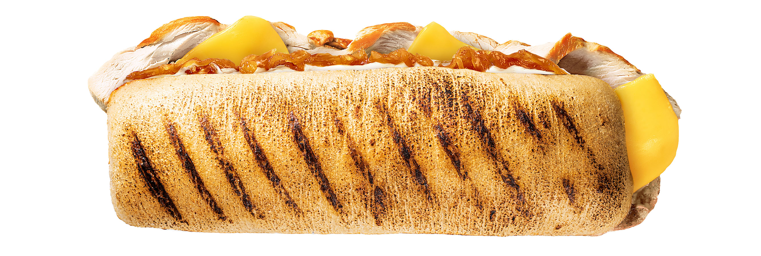 Panini filled with chicken, blue cheese dressing, caramelised onions, and cheese, ready to bake.
