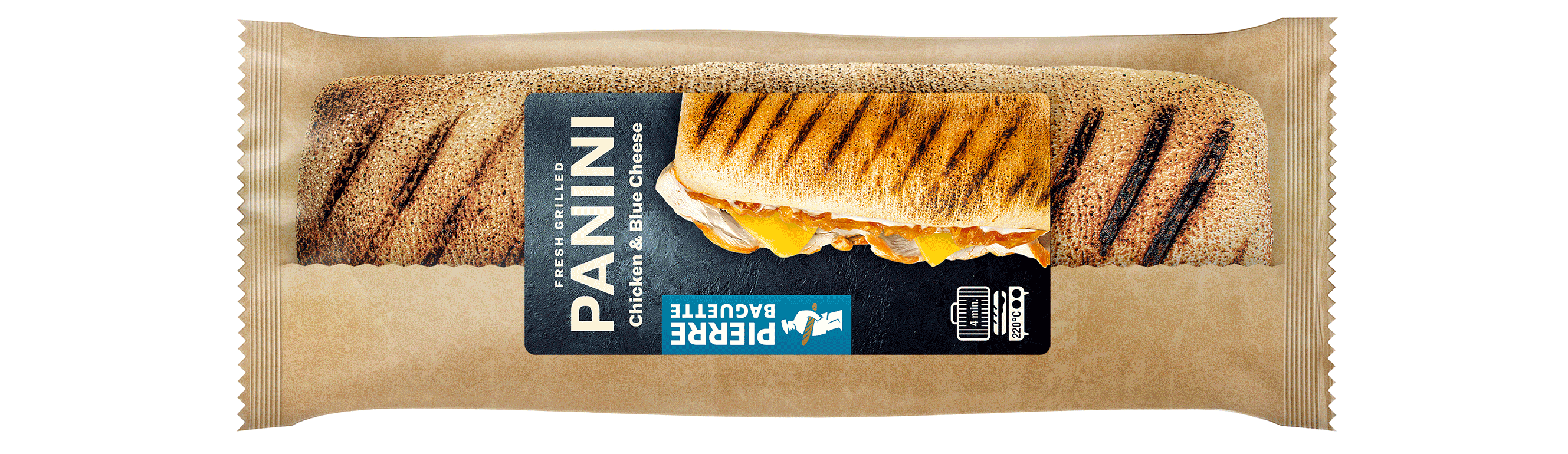 Panini filled with chicken, blue cheese dressing, caramelised onions, and cheese, ready to bake.